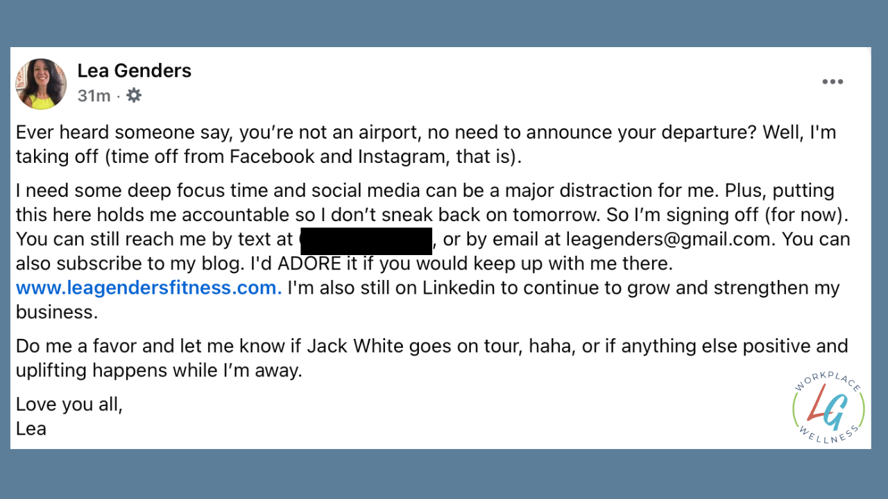 Somewhat ironically, I posted about this on Facebook for accountability, and then immediately felt the pull to watch for likes and comments. My FOMO (fear of missing out) is strong. What will I miss? What if Jack White goes on tour and I miss the announcement? haha. It will take more intention to reach out to friends and connections directly, rather than relying on social updates. But I also know that scrolling a feed is not the same as a meaningful connection. A like isn't a conversation. In the long run, this shift will strengthen my relationships rather than weaken them.