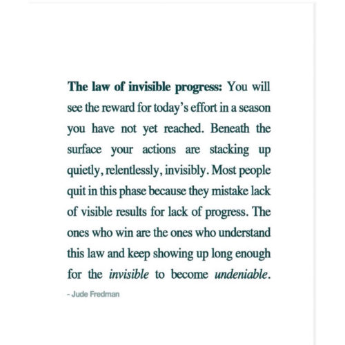 Actual progress, whether it involves your health, business, or company culture, requires patience and resilience. It means staying the course when results aren't immediately visible, trusting the process even when your inner critic is loud, and recognizing that real change occurs through small, consistent actions over time.